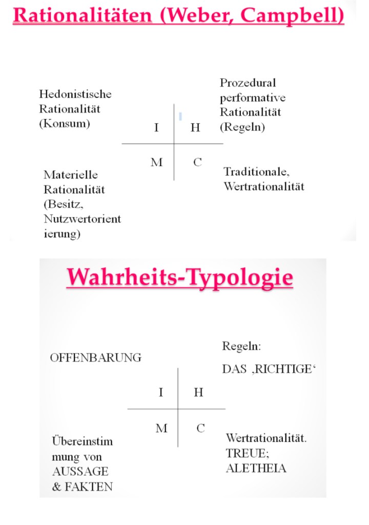 Um solche, sich daraus ergebende Unterschiede in Handlungsweisen und Verhalten an einem Beispiel anschaulich zu machen, möchte ich auf einen in unseren Gesellschaften[39] wiederkehrenden Disput[40] hinweisen. Vertreter der sogenannten freien Marktwirtschaft kritisieren gerne das Verhalten staatlicher Bürokratien wegen unökonomischer Verhaltensweisen und betrachten sie daher als unvernünftig. Sie fordern dann aufgrund ihrer eigenen Rationalität z.B. die Privatisierung staatlicher Unternehmen. Umgekehrt kritisieren die Vertreter staatlicher Bürokratien häufig jene wegen ihrer schwer zu überprüfenden Vorgehensweisen als unvernünftig. Bürokratien legen auf die Nachvollziehbarkeit von Prozessen großen Wert, und das kann aufwendig und ›unökonomisch‹ sein. Daher herrscht in staatlichen Bürokratien[41] eine andere Rationalität als in Unternehmen, die Kosten minimieren und Gewinne maximieren wollen. Dieser letztgenannte Typ von Rationalität wird mit Max Weber als ›substantielle‹ oder ›materielle Rationalität‹ bezeichnet. Jenen Typ, der von Bürokratien präferiert wird, bezeichnet man dann als ›performative Rationalität‹. Wie aus untenstehenden Diagrammen ersichtlich ist, pflegen alle vier Typen von Kultur unterschiedliche Rationalitäten und kommen so zwangsläufig zu unterschiedlichen Wahrheiten. Die Darstellung macht zugleich auch deutlich, warum es zwischen den Vertretern unterschiedlicher Kulturen zwangsläufig zu Un- und Missverständnissen kommen muss.